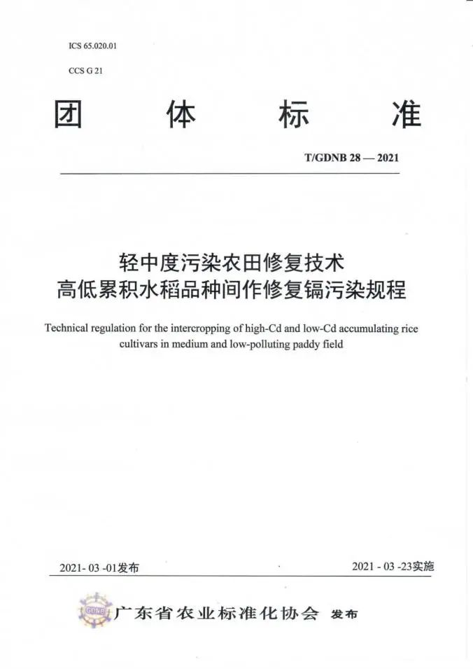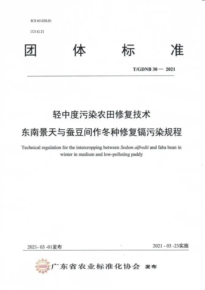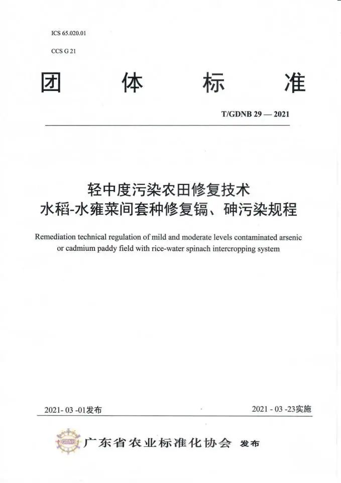 我司與華南農業大學資源環境學院、中國科學院地理科學與資源研究所等單位合作開展高低累積水稻品種間作修復鎘污染,水稻-水雍菜間套種修復鎘、砷污染,東南景天與蠶豆間作冬種修復鎘污染等研究工作,聯合起草了《輕中度污染農田修復技術 高低累積水稻品種間作修復鎘污染規程》(T/GDNB28-2021)、《輕中度污染農田修復技術 水稻-水雍菜間套種修復鎘、砷污染規程》(T/GDNB29-2021)、《輕中度污染農田修復技術 東南景天與蠶豆間作冬種修復鎘污染規程》(T/GDNB30-2021),通過廣東省農業標準化協會組織的標準審定并發布實施(2021年3月23日實施)。